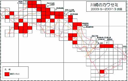 下図は、皆でできる自然調査の2003/5〜2007/3のカワセミ調査の結果に基づき、その生息分布をメッシュ図にまとめたものである。