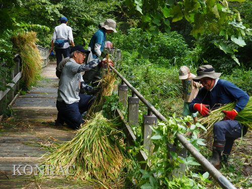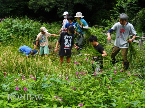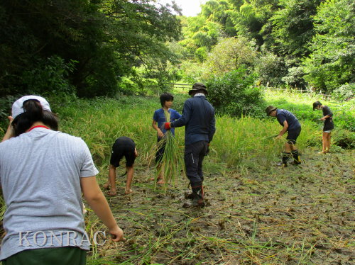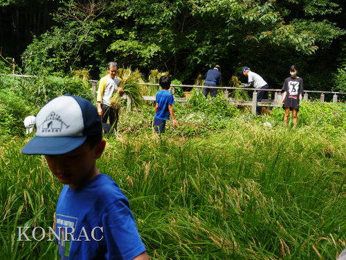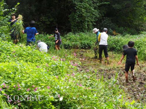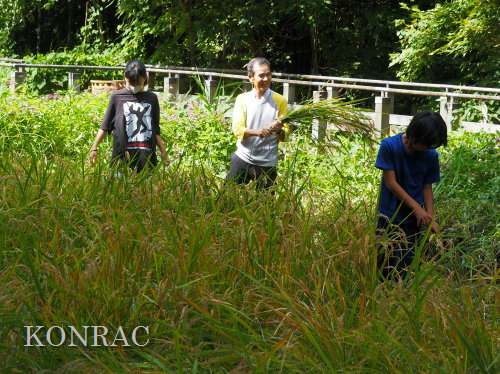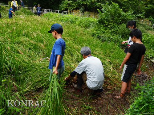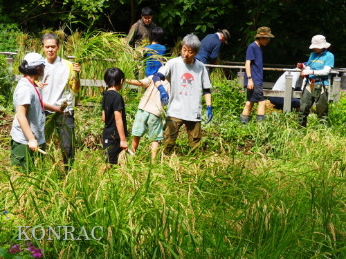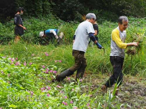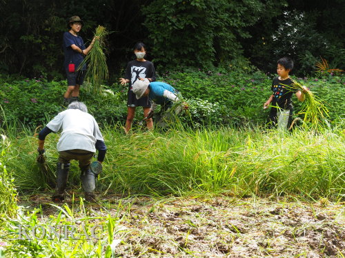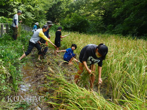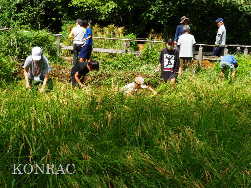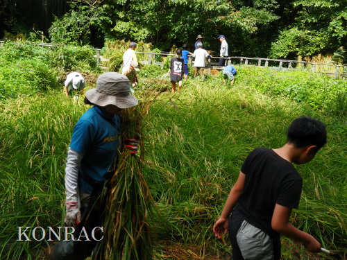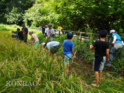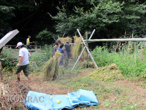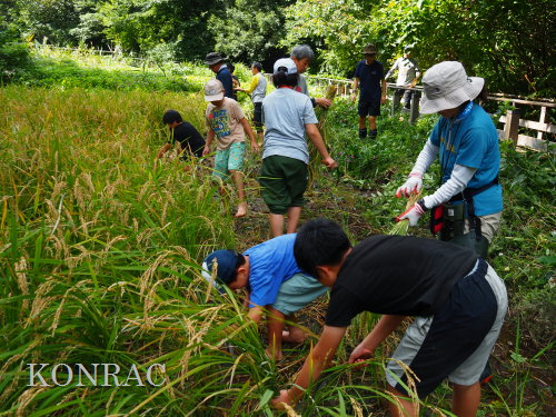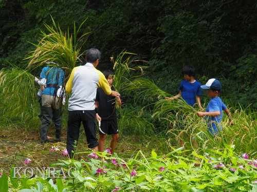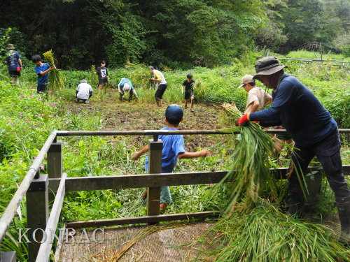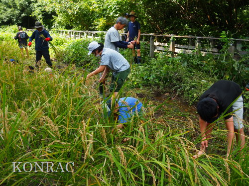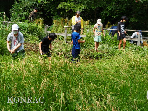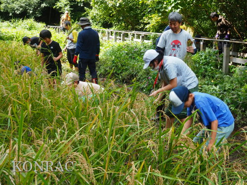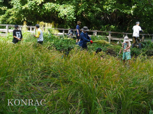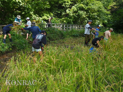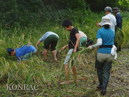 日時 2025年 9月 28日(日) 10:00〜15:00 晴 場所 集合 市民活動室 活動 上の田圃 参加(里山の自然学校 2年生)関山敢太、山崎晃汰 2名 (里山の自然学校 1年生)竹内羊、前場理宏、三重野寛、村田乙峰、山室幹太 5名 卒業生サポーター 安達湊都 里山倶楽部応援 東陽一、加登勇司、北川英樹、野下智洋 講師サポーター 伊澤高行、廣瀬朗子 講師・事務局 岩田臣生 合計 15 名 第8回の里山の自然学校は、稲刈りです。 集合した市民活動室では、鋸鎌を使った稲の刈り方について、安全な使い方を教えました。 ![]() 田圃に移動しました。 田圃は、水涸れしていましたので、大騒ぎにならずに、田圃に入ってくれました。 畦沿いなど、稲が倒伏している所では、どのように刈れば良いのかと迷っている場面もありましたが、 大部分の場所はスムースに稲刈りが進みました。 ![]() ![]() ![]() ![]() ![]() ![]() ![]() ![]() ![]() ![]() ![]() ![]() ![]() ![]() ![]() ![]() ![]() ![]() ![]() ![]() ![]() ![]() ![]() ![]() ![]() ![]() ![]() ![]() ![]() ![]() ![]() ![]() ![]() ![]() ![]() ![]() ![]() ![]() ![]() ![]() 下の段の稲刈りを終えて、上の段の稲刈りを始めました。 ![]() ![]() ![]() ![]() ![]() ![]() ![]() ![]() ![]() ![]() ![]() ![]() ![]() ![]() ![]() ![]() ![]() ![]() ![]() ![]() ![]() ![]() ![]() ![]() ![]() ![]() ![]() ![]() ![]() ![]() ![]() ![]() ![]() ![]() ![]() ![]() ![]() ![]() ![]() ![]() 木道の手摺に一時的に掛けておいた稲束を、子どもたちがオダ場に運んでくれました。 それをオダにかけていきました。 オダは新しくつくったばかりでしたが、途中で支柱が1ヶ所崩れてしまい、立て直してから、掛け直すという場面もありました。 ![]() ![]() ![]() ![]() ![]() オダにかけた稲束の上に、雨避けのシートをかけて、本日の稲刈りは終了し、記念の集合写真を撮りました。 里山の自然学校とは言いながら、田圃活動については、里山倶楽部の応援なしにはできなくなっています。 ![]() 応援参加してくれた里山倶楽部のメンバーは、ここで解散しました。 有難うございました。 皆が稲刈りを行っていた時は、オニヤンマ、オオシオカラトンボ、シオカラトンボ、マユタテアカネなどのトンボが飛来していました。 周囲に咲いていたツリフネソウでは、ホウジャクの仲間が吸蜜していました。 ![]() 田圃の水溜まりには、オオズズメバチが吸水に来ていました。 ![]() 残った里山の自然学校参加者は、お昼のお弁当にしました。 ![]() ![]() ![]() 午後は、稲刈りを終えた田圃のアメリカザリガニの駆除などを行いました。 ![]() ![]() ![]() ![]() ![]() ![]() ![]() ![]() ![]() ![]() ハンノキ林上の池では、アメリカザリガニ・トラップの中を確認しました。 ![]() 市民活動室への帰り道は、植物などの観察を行いました。 ![]() 市民活動室に戻って、活動の感想などを発表しました。 ![]() |