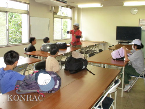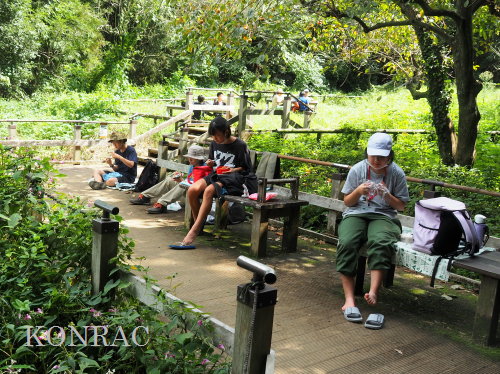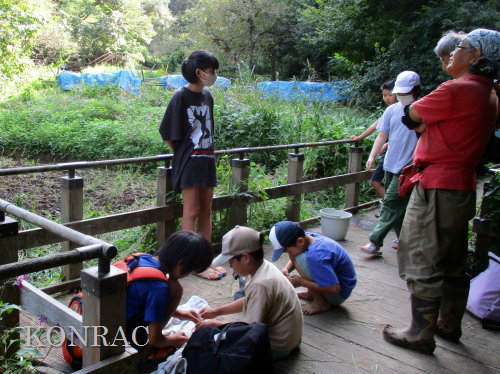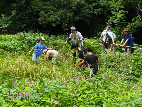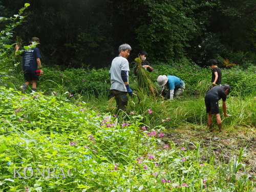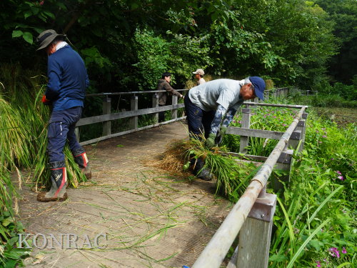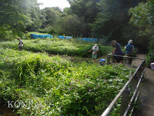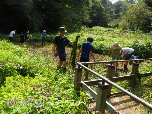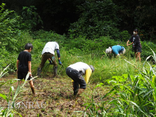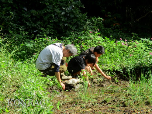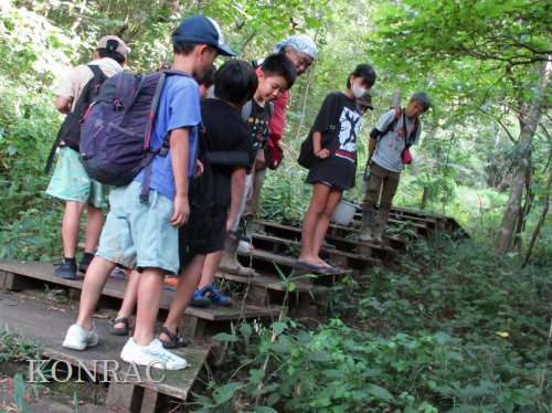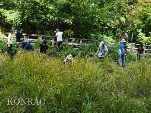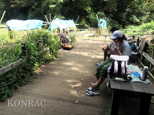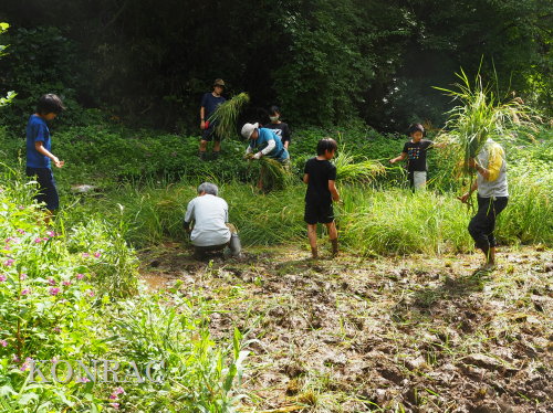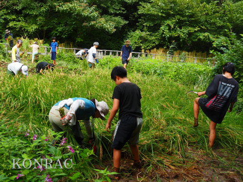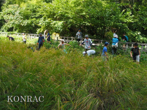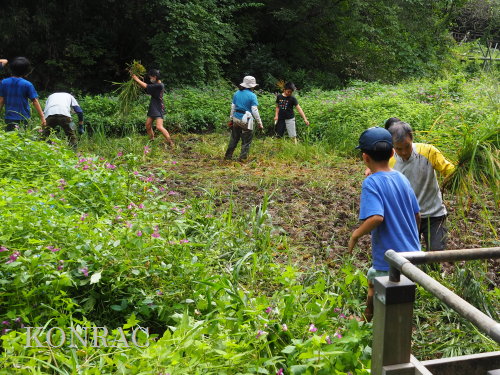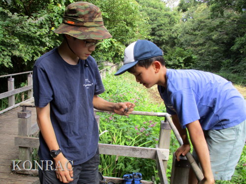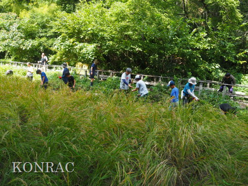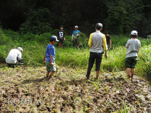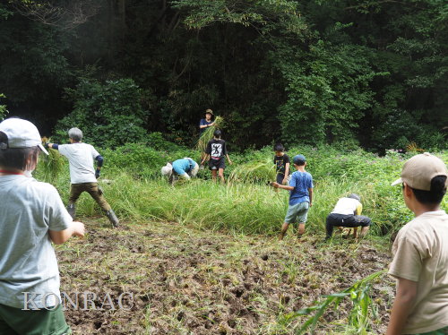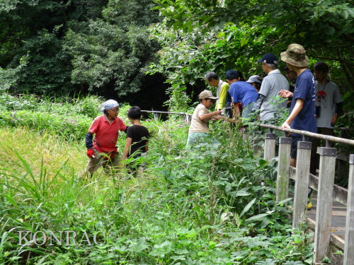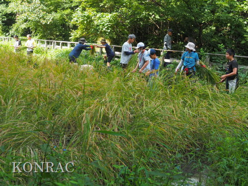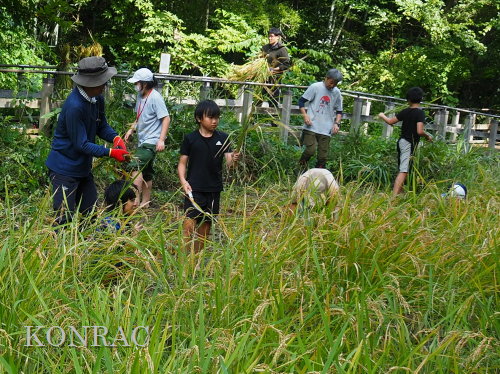 日時 2025年 9月 28日(日) 10:00〜15:00 晴 場所 集合 市民活動室 活動 上の田圃 参加(里山の自然学校 2年生)関山敢太、山崎晃汰 2名 (里山の自然学校 1年生)竹内羊、前場理宏、三重野寛、村田乙峰、山室幹太 5名 卒業生サポーター 安達湊都 里山倶楽部応援 東陽一、加登勇司、北川英樹、野下智洋 講師サポーター 伊澤高行、廣瀬朗子 講師・事務局 岩田臣生 合計 15 名 第8回の里山の自然学校は、稲刈りです。 集合した市民活動室では、鋸鎌を使った稲の刈り方について、安全な使い方を教えました。 ![]() 田圃に移動しました。 田圃は、水涸れしていましたので、大騒ぎにならずに、田圃に入ってくれました。 畦沿いなど、稲が倒伏している所では、どのように刈れば良いのかと迷っている場面もありましたが、 大部分の場所はスムースに稲刈りが進みました。 ![]() ![]() ![]() ![]() ![]() ![]() ![]() ![]() ![]() ![]() ![]() ![]() ![]() ![]() ![]() ![]() ![]() ![]() ![]() ![]() ![]() ![]() ![]() ![]() ![]() ![]() ![]() ![]() ![]() ![]() ![]() ![]() ![]() ![]() ![]() ![]() ![]() ![]() ![]() ![]() 下の段の稲刈りを終えて、上の段の稲刈りを始めました。 ![]() ![]() ![]() ![]() ![]() ![]() ![]() ![]() ![]() ![]() ![]() ![]() ![]() ![]() ![]() ![]() ![]() ![]() ![]() ![]() ![]() ![]() ![]() ![]() ![]() ![]() ![]() ![]() ![]() ![]() ![]() ![]() ![]() ![]() ![]() ![]() ![]() ![]() ![]() ![]() 木道の手摺に一時的に掛けておいた稲束を、子どもたちがオダ場に運んでくれました。 それをオダにかけていきました。 オダは新しくつくったばかりでしたが、途中で支柱が1ヶ所崩れてしまい、立て直してから、掛け直すという場面もありました。 ![]() ![]() ![]() ![]() ![]() オダにかけた稲束の上に、雨避けのシートをかけて、本日の稲刈りは終了し、記念の集合写真を撮りました。 里山の自然学校とは言いながら、田圃活動については、里山倶楽部の応援なしにはできなくなっています。 ![]() 応援参加してくれた里山倶楽部のメンバーは、ここで解散しました。 有難うございました。 皆が稲刈りを行っていた時は、オニヤンマ、オオシオカラトンボ、シオカラトンボ、マユタテアカネなどのトンボが飛来していました。 周囲に咲いていたツリフネソウでは、ホウジャクの仲間が吸蜜していました。 ![]() 田圃の水溜まりには、オオズズメバチが吸水に来ていました。 ![]() 残った里山の自然学校参加者は、お昼のお弁当にしました。 ![]() ![]() ![]() 午後は、稲刈りを終えた田圃のアメリカザリガニの駆除などを行いました。 ![]() ![]() ![]() ![]() ![]() ![]() ![]() ![]() ![]() ![]() ハンノキ林上の池では、アメリカザリガニ・トラップの中を確認しました。 ![]() 市民活動室への帰り道は、植物などの観察を行いました。 ![]() 市民活動室に戻って、活動の感想などを発表しました。 ![]() |