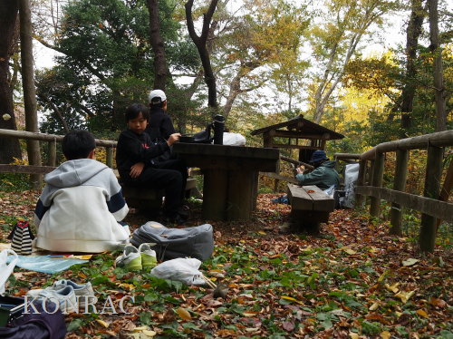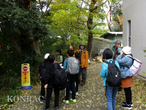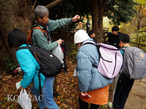 日時 2025年 11月 23日(日) 10:00〜15:00 曇 場所 集合 市民活動室 活動 活動図 参加(里山の自然学校 2年生)関山敢太、峰和菜子 2名 (里山の自然学校 1年生)數納太一、前場理宏、三重野寛、村田乙峰、山室幹太 5名 卒業生サポーター 安達湊都 講師サポーター 伊澤高行、廣瀬朗子 講師・事務局 岩田臣生 合計 11 名 第10回里山の自然学校<秋の里山>は、秋の生田緑地の自然を観察して歩いて、落葉や木の実など、里山の宝物を拾ってきて、リースなどをつくることにしました。 市民活動室に集合して、直ぐに外に出ました。