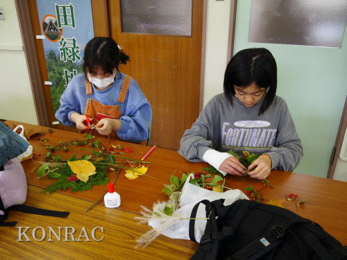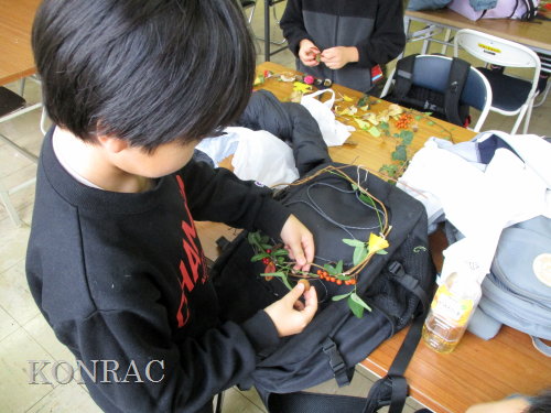 全員のリースづくりが終わったので、各自の作品を持って、集合写真を撮りました。