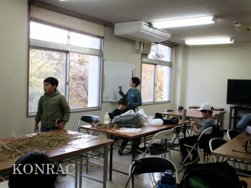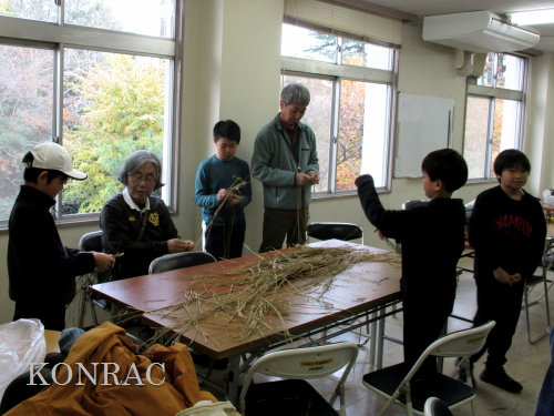 リースづくりが終わったら、希望者には、イネワラを使って、縄の綯い方の基本を教えました。
