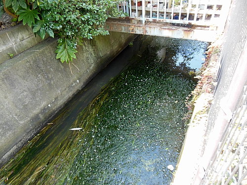 水辺調査 日時 2013/9/20(金) 11:00〜13:00 晴 場所 多摩川水系二ケ領用水 (多摩区登戸) 参加者 水辺調査班(岩田芳美) 今年度発足させた水辺調査班は他の班の調査を補足するために、身近な水辺を調査することにしました。 今回が、その第1回の調査です。 二ケ領用水も今では市街地の中の三面張りの排水路になっていますが、それでも多摩川からの水が流れていることから生物が生息しているようです。 この日は、3種類の藻類、エビの仲間、タイワンシジミ(要注意外来生物)などが観察されました。 この藻類のうち1種はオオカナダモという外来種でした。