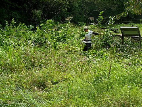 田圃周囲の草刈りなど 日時 2013/10/3(木) 10:00〜13:00 晴 場所 生田緑地 田圃 参加者 岩田臣生、岩田芳美、鈴木潤三 オニヤンマが田圃の周りを低く飛んでいました。