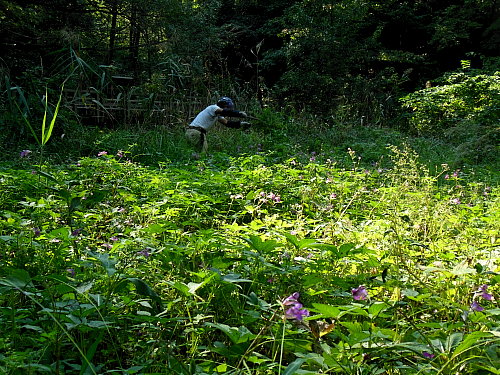 ヤマグワ等の除伐、ススキ、カナムグラ等の刈り取り、水流の管理 日時 2013/10/12(土) 10:30〜14:00 晴 場所 生田緑地 湿地 参加者 岩田臣生、岩田芳美 湿地の手入れを始めることにしました。 しかし、真夏の陽気に作業は捗りません。 水路の流れが途中で消えていました。 ジョレンを持って来なかったので、足で踏んで、穴を塞ぎました。 今年は、改めて、全流程を改修する必要がありそうです。 ツゲ、ヤマグワ、ウツギ、ヤマザクラ、モミジなど畦に生えていた実生を伐りながら、下草を刈りましたが、 10m程の範囲しかできませんでした。 ススキの下にはアザミやゲンノショウコが咲いていました。