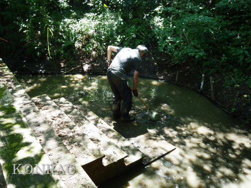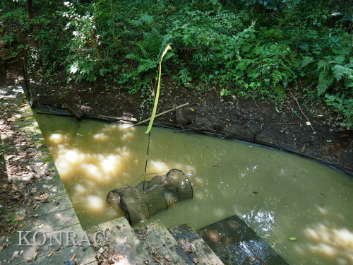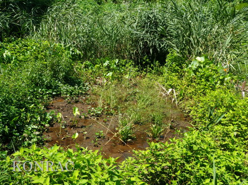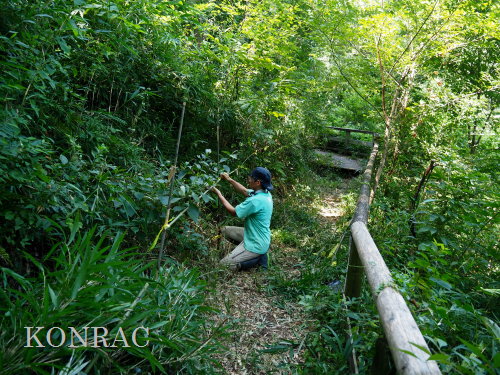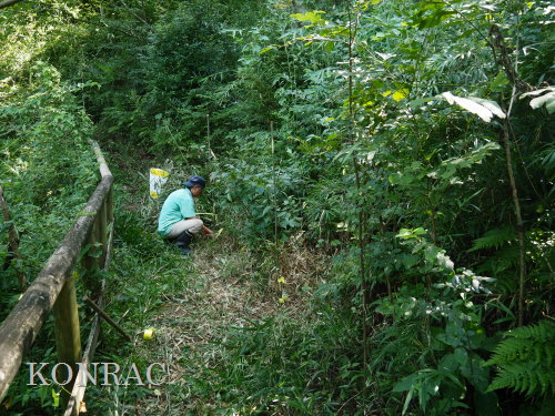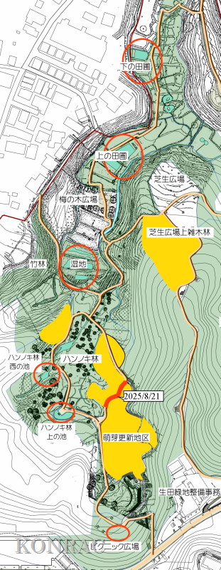 夏の生物多様性保全の活動 日 時)8月21日(火) 9:00〜12:00 晴 場 所)生田緑地 ハンノキ林源頭部自然探勝路、ハンノキ林西の池、湿地地区、上の田圃地区、下の田圃地区 活動者)岩田臣生、伊澤高行、田村成美 生田緑地で活動している皆さんでも、生田緑地の今夏の水不足を感じている人は殆どいないと思います。 生田緑地の湧水が、不透水層である飯室層の上に堆積した関東ローム層に貯留された雨水が染み出してきた水であることを理解している皆さんなら、 貯留可能量が如何に少ないかを想像できると思います。 そして、夏は植物が消費する蒸散量が多いことも想像できると思います。 出て行く量の多い夏に、降雨が少ない、入ってくる量が少ないのですから、湧水のつくる水流は涸れる所だ出てきます。 その湧水を頼りに生活している水流の水辺の生物にとっては、命の危機でもあります。 水田ビオトープ班では、夏の渇水期にも、水辺の生物が生き続けられるように、水流を連続する水溜まりにする水辺保全活動を続けています。 生田緑地のような急峻な地形の水辺では、流れ易い状態にしてしまうと、渇水期には完全に水面が消えてしまいます。 そこで、渇水期にも、小さな水面が残っている状態にしようと考えての水辺保全です。 しかし、それも、今夏は限界を超えたのではないかと思い始めています。 このまま、降雨が無ければ、谷戸の水辺の生物が消えていくことが想起されますので、雨が降るまでの間、水道水を分けてもらえないかとまで考えてしまいます。 最近の活動は、僅かの水を少しずつでも、必要な範囲に分けて、その範囲の生きものの命を守る方法を試しています。 普通に水辺保全活動ができない状況のために、この日も、下図に赤線、赤丸で示したような場所での活動となりました。 ![]() (ピクニック広場のトモエソウ保護) トモエソウは、植物班の佐藤班長によれば、川崎市内では生田緑地にあるだけだそうです。 ということは、生田緑地ピクニック広場のトモエソウだけということになってしまったようです。 トモエソウは、オトギリソウの仲間で、神奈川県植物誌によれば、県内に広く分布しているが、個体数は多くないとあります。 多年草ですが、放置すると周囲の植物に負けて消えていくのかも知れません。 私たちは、種子を採取しておいて、プランターで発芽させて、その苗を補植してやるようなことを、時々、行っています。 観察していると、追加した苗の方が元気が良いので、この場所にあり続けさせるためには、数本の追加を続ける必要がありそうです。 丁度、周囲の植物が繁茂する季節で、全体が覆われてしまっていたので、少し雑な草刈りを行いました。 実もあったので、これが成熟したら、採取して、苗をつくって、補植したいと思います。 また、ここは木陰で暗いので、どこか陽当たりの良い場所に植えてみることも考えたいと思いました。 ![]() ![]() (ハンノキ林源頭部の自然探勝路の植物保護) ハンノキ林源頭部、ハンノキ林と萌芽更新地区の境界となる自然探勝路のアズマネザサ刈りを、一昨日、8/19(火)に行いました。 ここには、オトコエシが大きく育っていて、間もなく開花時期となるところでした。 萌芽更新地区の花には、ツチバチの仲間や、アサギマダラが吸蜜に訪れていました。 この場所でも開花すれば、吸蜜源となるはずです。 ただ、谷側に向いて、茎を伸ばしていたので、来園者に折られないように、太めのアズマネザサを伐って来て、保護柵をつくりました。 また、ハナイカダ?の実生にも、保護柵をつくりました。 ![]() ![]() 9:41 WBGT 25.6℃、周囲温度 30.5℃、湿度 58.4% ![]() ![]() (ハンノキ林上の池) ハンノキ林上の池は、最近は、常に濁っていて、水質悪化が心配されていました。 初夏には見られたヤブヤンマにも、今年は出会えませんでした。 様々な原因が考えられますが、私たちとしては、谷戸の最奥の湧水による池として保全し、ホトケドジョウやカワニナなどが越冬できる池にすることだと思います。 そこで、長らく行っていなかったアメリカザリガニの駆除から始めてみようと思います。 池の近くに放り出しておいたアナゴカゴが使えるかどうかは分かりませんでしたが、 手網を使って、アメリカザリガニを10匹ほど採集し、これを、アナゴカゴに入れて、池の中に置いてみました。 池には泥が溜まって、すっかり浅くなっていました。 今日は、伊澤が泥上げをすると言って、肥柄杓を持って降りているので、後で、状態が分かると思います。 楽しみです。 ![]() (ハンノキ林西の池) ハンノキ林西の池も調べておくことにしました。 堤体の一部に大きな穴が開いていて、そこに池の水が、少しずつ流れ込んでいる様子でした。 池に流入する水量は、流れているのか判断するのが困難なぐらい少ない状態でした。 池の水位としては、涸れそうという感じはありませんでした。 ただ、この池は、オニヤンマやホトケドジョウなどの生きものの