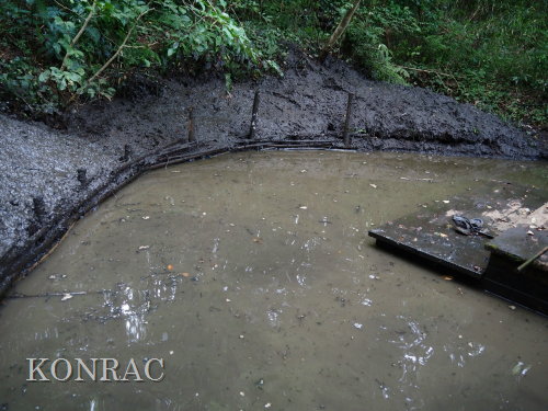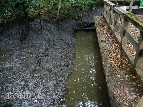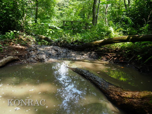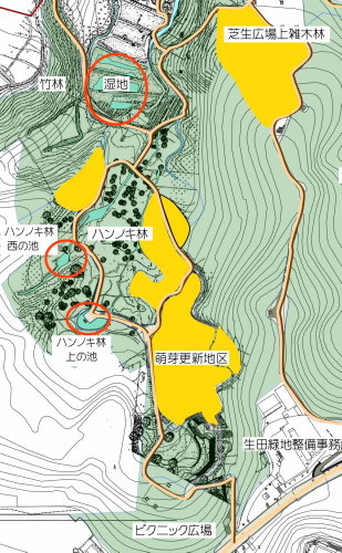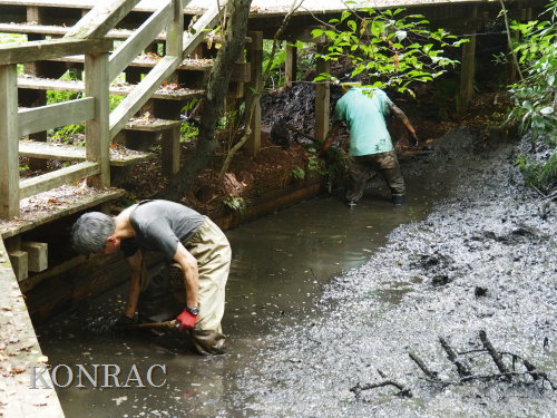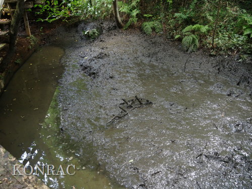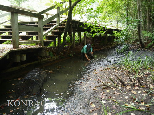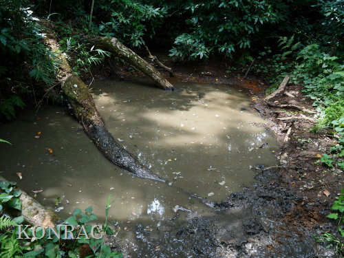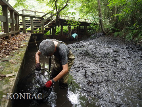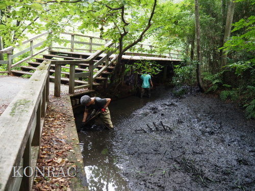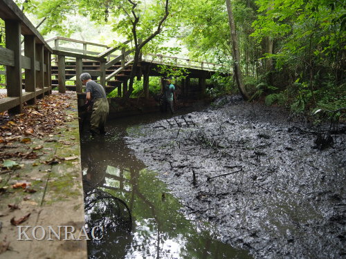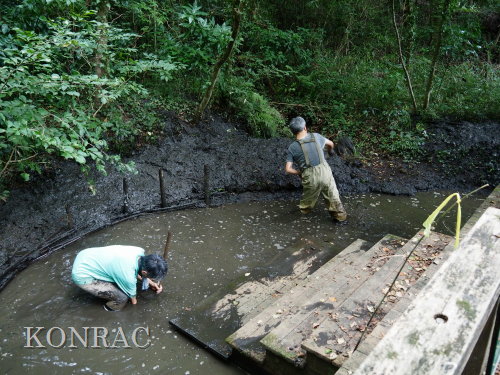 ハンノキ林上の池の泥上げなど 日 時)8月28日(木) 9:00〜12:00 晴時々曇 場 所)生田緑地 ハンノキ林上の池、ハンノキ林西の池、湿地地区 活動者)岩田臣生、伊澤高行、田村成美 生田緑地中央地区北側のハンノキ林地区からヨシ原地区までの谷戸は、湧水量が、今までに経験したことの無い量に減少し、至る所で、水辺が水涸れを起こして、 水辺の生きものの棲息環境としては壊滅的な状態になってしまいました。 私たち、水田ビオトープ班は、2004年以来、水辺に生き残った多摩丘陵の生きものが、将来に渡って生き続けられるように、水辺環境を保全する活動を続けてきました。 しかし、もはや、私たちの力では、どうしようもできない状態になりつつあります。 それでも、少しでもダメージを軽くしたいと思い、できることを探して、暑さに耐えて活動しています。 この日は、前回、8/26(火)に、湿地地区の水路に行った活動の結果の現状を確認してから、ハンノキ林上の池の泥上げを行い、 途中で、ハンノキ林西の池の泥上げと状態確認を行いました。 ![]() ウェイダーを持って、谷戸に降りました。 ハンノキ林上の池の泥上げを行う前に、一昨日、湿地地区で行った水路の状態確認を行うために、ハンノキ林上の池のデッキ上にウェイダーを置いて、 ハンノキ林の状態確認を行いながら、湿地地区に向かいました。 すると、ついに、ハンノキ林内の主要な水流も、水涸れを起こしていることが分かりました。 生田緑地中央地区に生き残ったゲンジボタルはどうしているだろうか、ついに、この谷戸から消えてしまっただろうかという心配に、 活動意欲が押し潰されてしまいそうになりました。 ハンノキ林内の水流が涸れたのですから、当然のことですが、一昨日、掘り直した水路に水はありませんでした。 田圃通信だけでは不十分と思ったので、この水路の変更について、考え方など、現地説明を行いました。 ハンノキ林上のデッキに戻って、ウェイダーを履いて、ハンノキ林上の池に溜まった泥を周囲に上げる活動を始めました。 冬のうちから、常に、水が黄色に濁っていたので、これでは、生きものの棲息は困難と思い、水質を改善する活動を行わなければならないと思いながら、 手がまわりませんでした。 夏期はホトケドジョウなどの湧水に依存する生物が集まっているはずの池ですが、早い時期から、水流が途切れてしまったので、 ここまで遡上できた生物は少ないだろうと思います。 ![]() 10:02 WBGT 23.8℃、周囲温度 27.9℃、湿度 64.6% 活動前にトラップに入っていたアメリカザリガニは 5匹でした。 活動中に捕獲したアメリカザリガニは 10数匹で、これはエサとしてトラップに入れました。 ![]() ![]() ![]() ![]() ![]() ![]() ![]() ハンノキ林上の池の泥上げが進んだところで、ウェイダーを履いているついでに、ハンノキ林西の池の状態観察も行うことにしました。 この池には、当歳魚を含む多数のホトケドジョウが、量は少ないながら、水温の低い流入水に向かって、集まっていました。 そこで、溜まった泥を水漏れ穴があった辺りを中心に、堤体上に上げる活動を行い、水深を深くしました。 この池は、湧水に依存する生物の避難場所になっていることを確認できました。 また、谷戸の水辺に、いくつもの小規模な溜め池的な機能を持つ池を配置することを考えるなら、一つの候補地になると思いました。 ここなら、生きものが下流域と往来できる状態にしながら、谷戸の奥の溜め池的な機能を持たせることができそうです。 ![]() ![]() ハンノキ林上の池の泥上げも進んで、コロイド状態だった泥を上げることができましたので、水深30cm程度の水域をつくることができたと思います。 水は酸欠気味なのか、5cm大程のホトケドジョウが数匹、水面近くを泳いでいました。 ![]() ![]() ![]() 暑い夏には行いたくない活動でしたが、湧水減少については、少なくとも、ホトケドジョウが消える事態にはなっていないことが確認できました。 問題は、ゲンジボタルですが、これは、迂闊な調査はできません。 |
