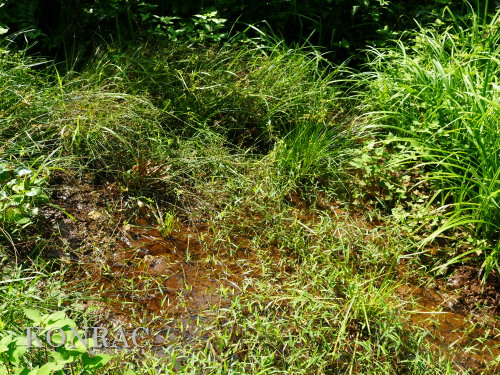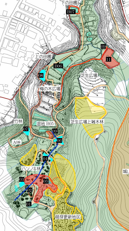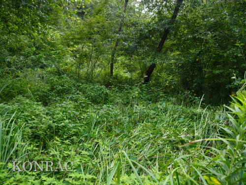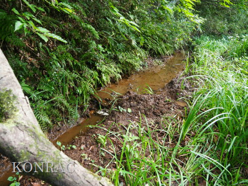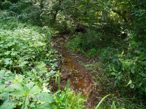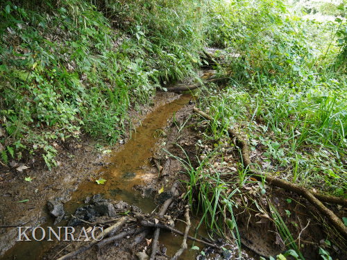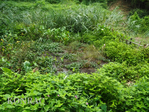 谷戸の水辺観察と保全 日 時)9月16日(火) 9:00〜12:00 晴 場 所)生田緑地 谷戸 活動者)岩田臣生 ![]() 湿地地区(B05) ハンノキ林から湿地地区に導水している水路の改修が、ハンノキ林の水涸れが起こったことで中断していました。 ハンノキ林西側の水辺は、水流が回復して、湿地地区への導水路にも水が流れるようになりましたので、水路の改修を完了させることにしました。 ![]() 湿地地区は、全域の水辺に水面が広がっていました。 ![]() ノハラアザミ、キツネノマゴ、カナムグラなどが咲き、辺りには、ツリフネソウの花が多数咲いていました。 ![]() ![]() 9:52 暑さ指数 WBGT 22.2℃、周囲温度 27.2℃、湿度 63.6% 上の田圃地区(B06) 稲刈りを9/28(日)に予定していますので、オダの状態を調べました。 その結果、今年はオダを新しくする必要がありました。 また、オダ場の草刈りも済ませなくてはなりません。 ![]() イネは、黄金色に実っている様子です。 ![]() ![]() マユタテアカネが現れました。 ![]() 谷戸右岸水流(09) 谷戸右岸水流の状態を観察し、ミヤマシラスゲなどが繁茂する湿地に、水が入るように調整しながら、城山下谷戸合流部に移動しました。 ![]() ![]() 谷戸合流部(11) 谷戸右岸流につくった落枝ダムによる水溜まりには、ホトケドジョウがいました。 ![]() 湿地を造ろうとしている場所の水は涸れていましたので、少し上流から調べて、水漏れ穴を潰してみたら、少し流れだしました。 ![]() オオブタクサが数本生えていましたので、刈りました。 ![]() 10:57 暑さ指数 WBGT 26.3℃、周囲温度 28.3℃、湿度 82.1% 下の田圃(B07) ![]() ハンノキ林(A07) この日は、ハンノキ林の木道を歩いて、湿地地区に直行したので、水辺の状態が回復したと思ってしまい、谷戸の下流域の観察点検を優先してしまいました。 しかし、ハンノキ林まで戻って来て、課題の(05)の水辺を丹念に調べて、可能な手入れを行おうと思ったら、この辺りの水面は完全に消えていました。 (05) 9/13(土)の里山倶楽部の時に、問題の谷底に水溜まり穴を掘りましたが、そこは、水面が広がっていて、オオスズメバチが飛来していました。 ![]() その水辺に続く下流域を調べましたが、湿った土が続いているだけで、水面はありませんでした。 ハンノキ林上の池を調べましたが、水はオーバーフローしていませんでした。 ハンノキ林東側の水辺の再生が課題であることが明らかになりましたが、その解決策は、簡単には、見つかりそうもありません。 できることは、斜面の勾配に合わせて、数個の大きな水溜まりをつくることだと思います。 つまり、できるだけ長時間、水が滞留しながら、確実に水が循環する流れをつくることです。 しかし、それは容易なことではありません。 堰をつくる場所として良さそうな、幅が狭くなりそうな場所は見つけました。 しかし、太陽の日差しが暑くて、もう体を動かす気も起きません。 この日の活動は終わりにすることにしました。 ![]() ![]() ![]() ![]() 暑さ指数 WBGT 28.6℃、周囲温度 30.0℃、湿度 85.2% |