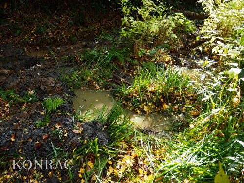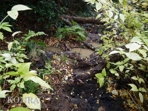 (上図)11/27(木)の活動場所図 久し振りの野鳥の森の水流は、水面が消えて、湿った土面が続いていました。 しかし、スコップを入れたら、柔らかい土で、掘った穴には直ぐに、水が湧いてきました。 ハンノキ林の現状とは雲泥の差があるのに驚きました。 20cm程度の深さの水溜まり穴が簡単に掘れて、次の水溜まり穴を掘っているうちに、開放水面が広がっていくのです。 ただ、スコップを使う穴掘りは腰の負担が大きく、毎回行ってきた範囲だと思うのですが、1回で完了することはできませんでした。