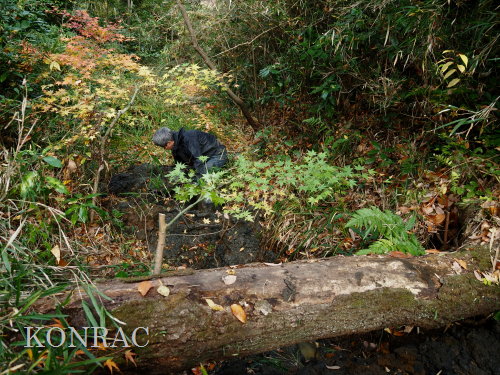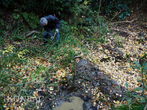野鳥の森の水流の水辺保全 日 時)12月2日(火) 9:00〜12:00 曇 場 所)生田緑地 野鳥の森の水辺(B01) 活動者)岩田臣生、伊澤高行 野鳥の森の水流の保全活動は、14年前、2011/11/29(火)に始めた活動で、 数年に1回、水流に溜まった土砂を掘り上げています。 今年は、2025/11/27(木)に行いましたが全域の泥上げを済ますことができませんでしたので、 今回、その続きを行いました。