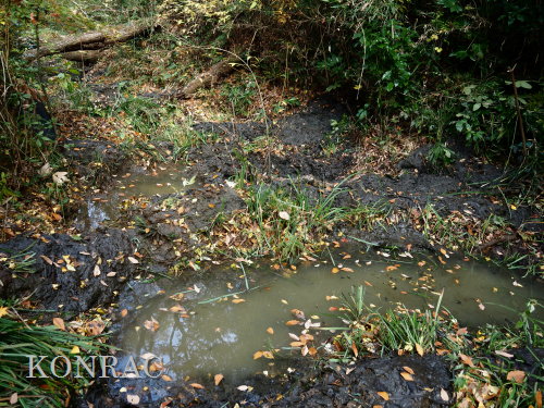 泥面と言っても、足を踏み入れれば、ズボッと潜るような柔らかい泥溜まりです。 周囲の草木、枯枝、落枝などを積んで、その上に、泥を上げて、堰をつくることで、水溜まり穴をつくります。 そこに水が溜まるまでには時間がかかりますので、後は自然に任せます。