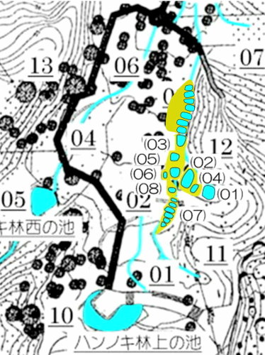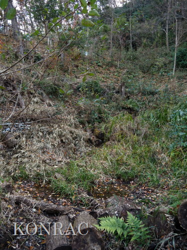 ハンノキ林の水辺保全 日 時)12月9日(火) 9:00〜12:00 曇時々晴 場 所)生田緑地 ハンノキ林(A07) 活動者)岩田臣生 ハンノキ林西側地区の水辺保全については、ハンノキ林西の池からの水流について、今まで続けてきた"連続する水溜まりづくり"を継続することで良さそうです。 問題は、ハンノキ林東側地区の水辺保全ですが、その方法を見つけられずにいます。 現状としては、水の状態について、少しずつ調べています。