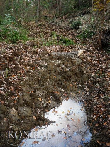 水溜まり穴03は、最初は 9/23(火)に掘ったものですが、 11/25(火)には、水溜まり穴03を東側の水流の溜め池にするために、ハンノキの伐採材を4本積んで、堰堤をつくることを試しました。 しかし、12/4(木)は、水が消えていましたので、11/25(火)に材を積んだ堰堤からの水漏れを止めるために、粘土の貼り付けを行いました。 12/9(火)は、水は涸れずに残っていましたが、水が増えて溜まっているとは思えませんでした。
