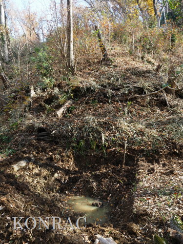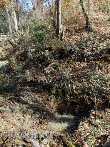 この日の課題は、斜面の裾部には水が絞り出されていると考えて、斜面の裾部を削って、水溜まり穴を繋げることにしました。