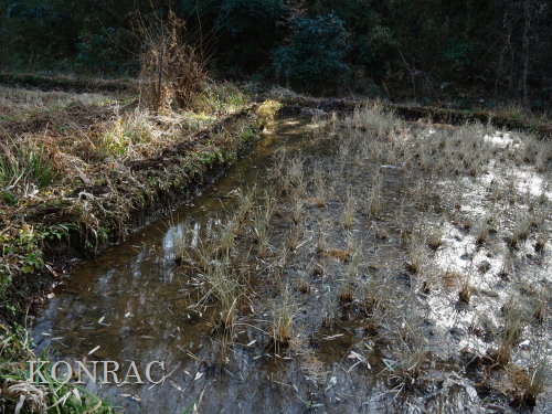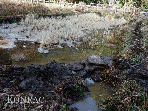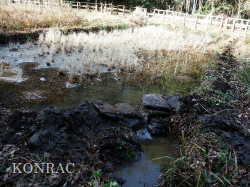 この積み直し作業中に流れ出た水は下の段に広がって、田圃の中央部でも、土の少ない辺りには水面が広がりだしていました。 導水路上流部の水路再生によって、導水路の流量は格段に増えて、田圃の上の段には大量の水が溜まっていたようです。