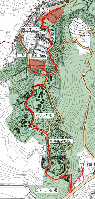 (上図)活動場所位置図 2026/1/8(木)と2026/1/13(火)に、田圃への導水路の上流の谷戸左岸流の泥上げを行ったので、田圃に入る水量が増大しているはずです。 そこで、今日は上の田圃の手入れを行って、状態を把握するために谷戸に降りました。 すると、ピクニック広場周辺にいた沢山の野鳥が飛び立って、木々から木々に飛び交いました。 ただ、残念ながら、種の見極めはできませんでした。 ハンノキ林の木道を歩いていくと、西側のヤブの中に、ジョウビタキ(メス)がいました。 上の田圃の辺りには、アオジ?が群れていました。 上の田圃の上の段には氷が張っていました。 田圃上の水路には、水面が広がっていました。 しかし、下の段には、畦沿いに微かな水面があるだけでした。 下の段の芝生広場側の畦沿いに、スコップで深い溝を掘り、上の段の堰下の水路部分も掘って、上の段の土嚢堰の状態を調べました。