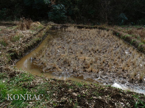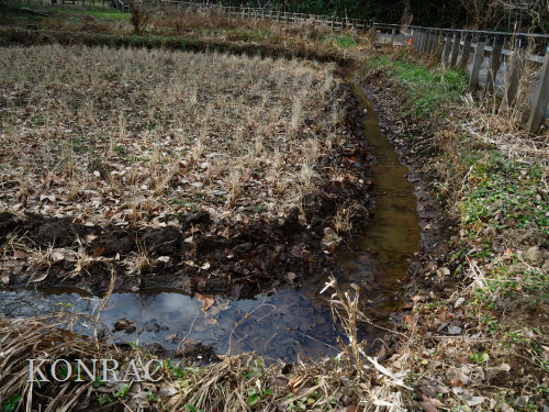 しかし、下の段には地面が広がっていました。 ただ、その土は湿った土でした。 水漏れ穴が見つかれば、それが原因だと思うのですが、非常に少ない流量の水が田圃の土に染み込んで消えているとしか考えられません。 畦沿いの溝を掘り直しながら、水漏れ穴かも知れないと思わせる穴を塞いで、外周の水面の輪をつくりました。