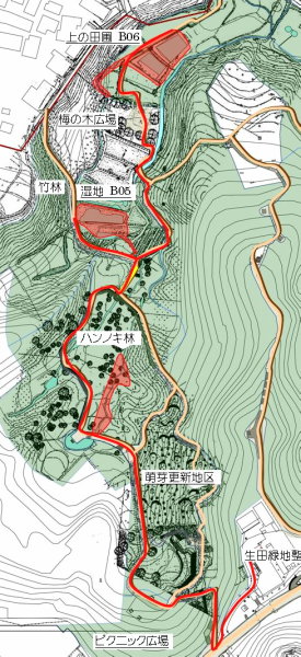(上図)活動場所位置図 (イ)上の田圃を湛水させる活動 アズマヒキガエルが繁殖のために集まってくる前に、上の田圃を湛水させなければならないと思い、上の田圃に直行しました。 上の田圃の上の段には水面が広がっていました。