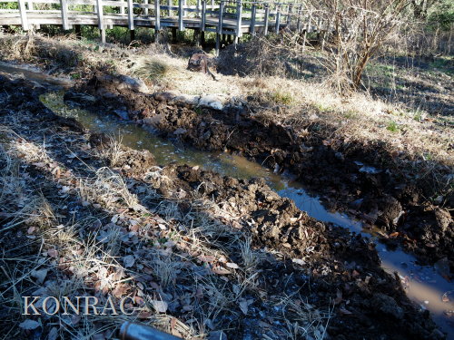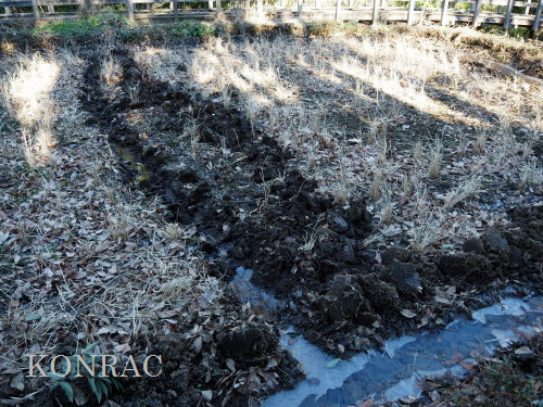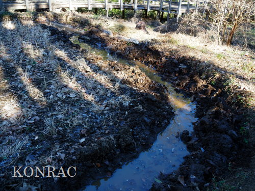 導水路からの水は、木道下を抜けて流れてきていますが、この日の湛水は諦めて、湿地地区に移動しました。。