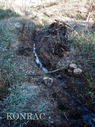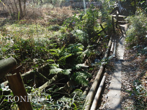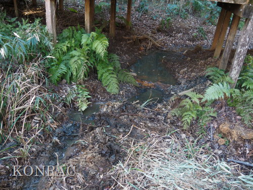 (ロ)竹林下辺りの谷戸左岸水流(湿地地区) 今までは、竹林と湿地地区の間の谷戸左岸水流の上端部は、湿地地区1段目からの水と竹林下谷戸からの水を、湿地地区2段目に入れるための場として管理していました。 これからは、谷戸左岸水流を上の田圃に水を供給するための水流として、意識的に保全することを考えました。 その保全管理の基本は、ホトケドジョウやオニヤンマなどの生物が、谷戸の水辺を自由に往来できることだと考えました。 現状は、竹林下の園路の路面が崩れて、柵が水流内に倒れ込んで、伐採材などを捨ててあったり、ヤブになったりしていました。 今回は、この合流部のアズマネザサやシダを刈って、除けられる材は除けて、水流の状態を確認できるようにしました。