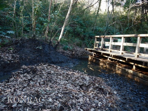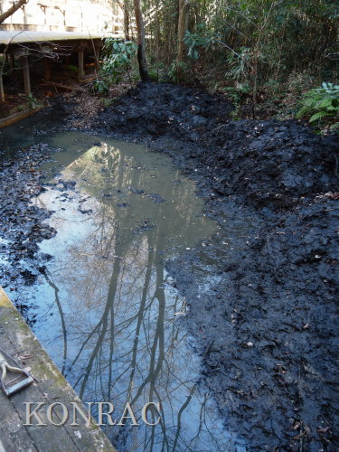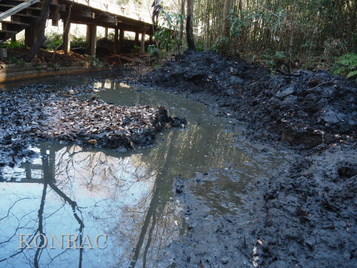 ハンノキ林上の池の泥上げは、今回で、やり終えたいと思いましたが、粘土混じりの土砂の中に、落枝や竹、建設廃材などが埋もれていたりして、 完了とは言い難い状態でしたが、時間が来たので、この日の活動を終えました。 腰痛持ちの後期高齢者1人の活動ですから、これだけできれば上等だと思います。 後は、水底に沈んで溜まっている泥を取り出すこと、樹林に掘られていた水路の確認と泥上げを行うこと、堰の内側に溜まっていた泥を掘り上げること、 周囲の樹木を間伐し、アズマネザサを刈ることなどを行えば、現段階でのハンノキ林上の池の手入れは完了します。