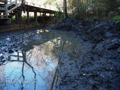 昨秋以降、ハンノキ林の水辺を再生しようと取り組んでいました。 ハンノキ林上の池の水の活かし方が課題だと思っていましたので、降雨の期待できない時期とは思いながら、一先ず、泥上げを行うことにしました。 一昨日、1/27(火)に、ハンノキ林上の池の堰の板1枚を外して、池の水を流しましたが、その流れは止まっていました。 同日、池の1回目の泥上げを行いました。 そして、この日は、その池の水面はすっかり下がっていました。