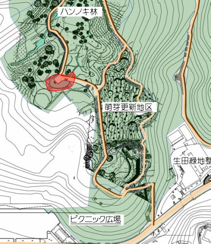 (上図)活動場所位置図 谷戸に降りると、ピクニック広場に積んだ落葉の山に、メジロが集まっていました。 一昨日、集まっていた中にいたのも、メジロだったことを確認できました。