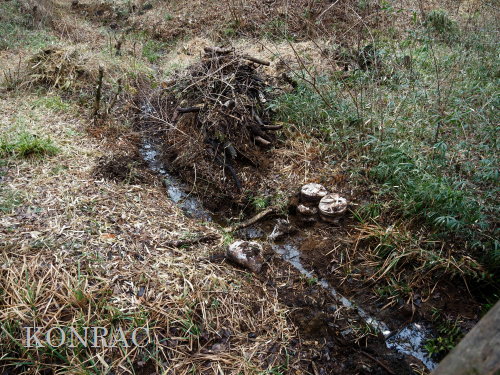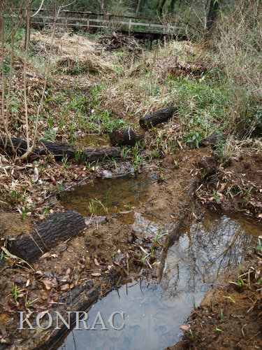 城山下谷戸合流部を見に行きました。 谷戸右岸流につくった堰は壊れておらず、水溜まりができていました。