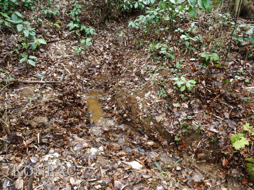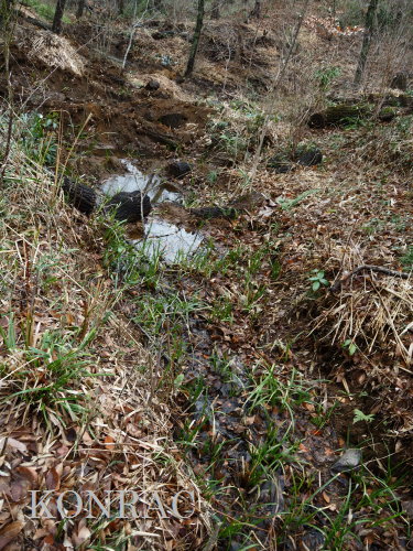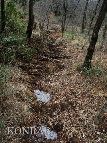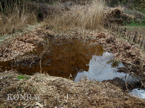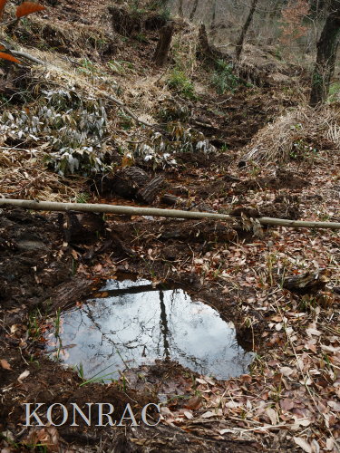合流部につくってきた水溜まりは、一昨日と変わらず、涸れていました。 城山下谷戸の水流を遡ってみましたが、落葉が敷き詰められている状態で、水は、その下が濡れているという程度でした。