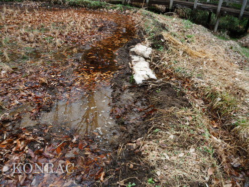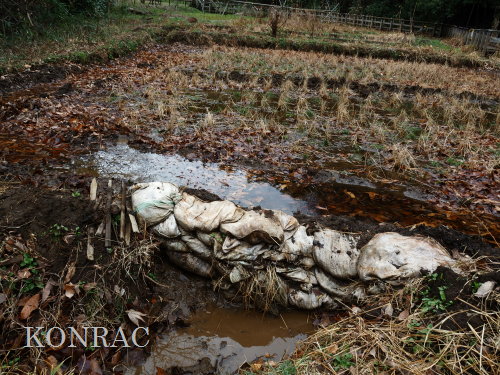 ハンノキ林の水の状態は分かったので、上の田圃に移動しました。 上の田圃は、落葉が沈んで、水面が見えるようになっていました。 しかし、下の段の土嚢堰から水が流れ出ていました。 そこで、その辺りの土嚢堰の内側の土を踏み固めたところ、流れ出ていた水が止まりました。 踏み固めた上に、イネワラをを置いて、その上に田圃の土を置いて、踏み固めました。 水漏れを止めたので、これで湛水できるかも知れません。