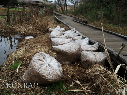 下の田圃に行きました。 落葉の入ったビニール袋が積んでありました。 上の田圃に落葉を投入した時に、下の田圃の落葉も投入するのを忘れていました。 急いで、落葉を投入しました。