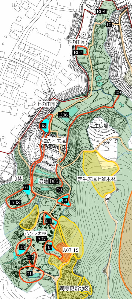 令和 7 年度第 11 回里山倶楽部 ハンノキ林東地区の更新管理(下草刈りなど) 日 時)2025年9月6日(土) 9:00〜12:00 晴 場 所)生田緑地 ハンノキ林東地区(A07-12) 参加者)東 陽一、伊澤高行、廣瀬朗子、吉澤正一 事務局)岩田臣生 計 5 名 ![]() (上図)活動場所図 ハンノキ林東地区は、ナラ枯れ大径木伐採などを2024年1月に終えました。 それから、1年半が経過しましたので、コナラ実生などが1mほどに成長しています。 その発芽してから2年目のコナラの周囲のアズマネザサや、他の実生木などを除伐して、コナラの成長を保護する活動を行いました。 今夏は、暑くて、降雨の無い夏を経験し、谷戸の水辺は涸れて、水面が見られなくなりました。 このため、伐採更新の更新管理と共に、水辺の状態も観察できるということで、今回の活動場所を選びました。 丁度、前日、9/5(金)に、台風が接近して、待望の降雨がもたらされましたので、水辺が回復したのかどうか、観察しておきたいと思いました。 そこで、里山倶楽部の活動を始める前に、谷戸の水辺の観察会を行いたいと、参加者に提案したところ、全員が参加したいとのことでしたので、 谷戸の水辺と水田ビオトープ班の水辺保全の活動を簡単に紹介する観察会を開催しました。 谷戸の水辺の観察会 (05) 今回の活動場所(A07-12)の急斜面の下の水辺(05)を、一番のゲンジボタル棲息地と考えて、水辺保全活動を行っています。 (01)ハンノキ林上の池 この池は、四阿を撤去して、ハンノキ林内の木道を布設替えし、広場を木製デッキに変えた1998年1月に造成されたものと考えています。 流入するはずの湧水量が非常に少なくなって、水はデッキ下の堤を越えることができず、単なる水溜まりになって、9/3(水)には、非常に水位が下がっていました。 昨日の降雨によって、水位が上がっていることが感じられましたが、堤を越水するところまでは増えていませんでした。 (02)木道沿いの湿地 水溜まりが復活していました。 (03)ハンノキ林西の池 昔、北部公園事務所の職員が掘ったと聞いているトンボ池ですが、手入れを重ねてきました。 ホトケドジョウ、オニヤンマ、ヤマサナエ、カワニナなどが利用していること、 この辺りがホタル出現ポイントにもなっていること、野鳥が利用する水場でもあることなどを説明しました。 池から越水する水は、9/3(水)よりも増えていました。 ![]() 木道沿いのカラスザンショウの木に、カラスアゲハが来ていました。 (04) ハンノキ林内を流れる2本の水流は、木道近くまで流れてきていました。 (B05)湿地地区 8/26(火)に、水が無い状態で水路の改修を行いましたが、その水路に水面が広がっていました。 ![]() ![]() 竹林下谷戸からの水流も復活していました。 ![]() (07)竹林下谷戸 アズマネザサ刈りや、倒木の片付けなど、里山倶楽部でも活動していた場所ですが、 この出入口部分に、溜め池をつくりたいと考えています。 ここから上の田圃地区までの間について、谷戸左岸の水流を階段状にする活動を行いたいと考えています。 (08)上の田圃地区の導水路辺り 今夏は、この導水路も涸れましたので、この場所に、谷戸左岸水流を受け止める溜池をつくりたいと考えています。 この日は、導水路の水が復活していました。 ![]() (B06)上の田圃 上の田圃は、2005年、2006年に再生した田圃で、里山の自然学校の子どもたちが田植え、稲刈りを行っています。 最近は、田植えや稲刈りを里山倶楽部の皆さんに応援していただいています。 調査団では、谷戸の田圃を生きもののための田圃として管理しています。 上の田圃の稲は、穂を重そうにしていましたが、倒れてはいませんでした。 ![]() ![]() ![]() すっかり翅が傷んだクロアゲハ?が、クサギの花に吸蜜に来ていました。 ![]() (B07)下の田圃 下の田圃は、2004年に再生した田圃です。 膝上まで潜る湿田で、ヤマトクロスジヘビトンボ、クロセンブリ、ホトケドジョウなど、多摩丘陵の在来の生きものが棲息しています。 クワイ、コナギ、チョウジタデなどが繁茂していますが、県内では生田緑地だけになってしまった絶滅危惧種を保護しています。 9/3(水)には水が涸れましたが、この日は流れていました。 ![]() 水面ができたからでしょうか、シオカラトンボが群れていました。 ![]() (10)ホタルの里整備事業によって造られた水路 涸れていた水路に水が流れていました。 ![]() (B06)上の田圃地区 上の田圃下草地は、一面のカナムグラに覆われていました。 ツリフネソウなどの花を観察できるように、カナムグラ刈りが必要な状態でした。 上の田圃上の草地に1輪、ツリフネソウが咲いていました。 ![]() ![]() (A07-12) ハンノキ林東地区に戻って、更新管理の活動を始めました。 ![]() ![]() ![]() ![]() ![]() ![]() ![]() ![]() 休憩後、記念の集合写真を撮りました。 ![]() ![]() (04)〜(05) 短時間ではありましたが、ハンノキ林東地区の斜面から下に降りて、谷底を調べて歩きました。 水面は部分的に少しだけありましたが、底土は硬く固まっていました。 水